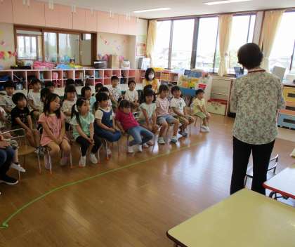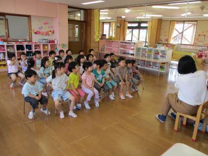 ボランティアの方が来られお話の会をしてくださいました。子どもたちもボランティアの方が読んでくれる絵本に興味津々‼見入っていましたよ‼またどんなお話を読んでもらったのか、お子さんに聞いてみてください。