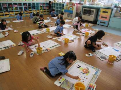 今日は昨日の遠足で楽しかったことをみんなで話し合ったり、楽しかった場面や印象に残っている場面の絵を描きました。「キリンの耳は中が茶色だった」「トラは後ろを向いていた」と色や形を思い出しながら描いていましたよ。