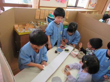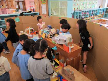 午後からはぱんだ組さんに「お店屋さんに遊びに来てください」と声をかけ、お客さんになって遊びに来てもらいました。「いらっしゃいませー!」と呼び込みをしたり、遊び方を教えてあげたりと、優しく接していた子供たちです。