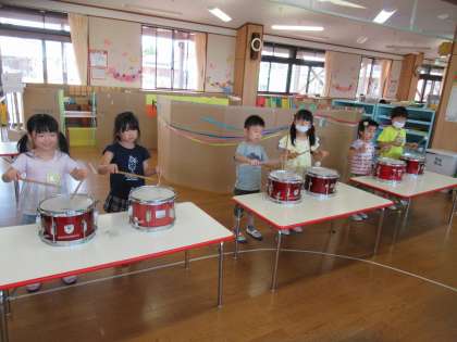 今日は鼓隊で使う楽器に触れてみました。最初に楽器の名前を聞くと、知っている子も多く「やってみたい!」と興味津々の子供たちでした。バチの持ち方、楽器の扱い方、叩き方を知らせると真剣な表情で聞いていた子供たち。実際に鳴らしてみると、大きな音にびっくりしている子、バチをもって嬉しそうに叩く子など、様々でした。全ての楽器に触れて楽しそうな表情も見られました。これから繰り返し様々な楽器に触れていきたいと思います。