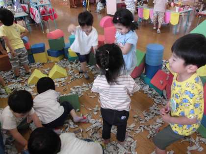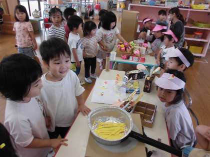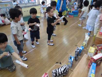 ぱんだ組やこあら組のお店屋さんに招待してもらいました。アイスクリームやわたあめ屋さん、お風呂等、たくさんの面白いお店があり、りす組・うさぎ組の子供たちは「すごい!」「楽しそう」と喜んでいました。ぱんだ組のお姉さん、お兄さん達に「どれにする?」「一緒に行こうね」と優しく案内してもらい、色々なお店でお買い物をする体験ができました。飲食スペースでは、友達や先生と一緒に食べたり、買った食べ物を友達におすそ分けをしたりする様子も見られ、楽しいひと時を過ごすことができました。