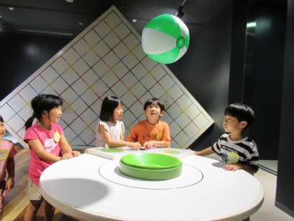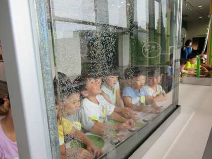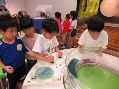 プラネタリウム観覧の後は、博物館の展示コーナーや実験コーナーで遊びました。動く恐竜の標本や様々な実験など、思い切り楽しんでいました。