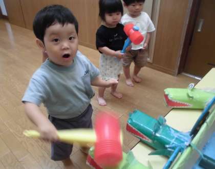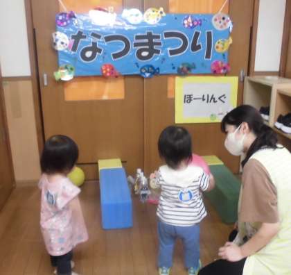 夏祭りをしました。(ぺんぎん組) 公開日 2023/07/18 更新日 2023/07/18 年間行事 夏祭りがありました。お友達や先生と一緒に手を繋いで、ワニたたきやボーリングの縁日をまわりました。ワニたたきでは穴から出てくるワニにびっくり!ピコピコハンマーでたくさんたたく子どもたち。ゲーム後には自分で選んだスタンプを夏祭りカードに押すと嬉しそうに見つめていましたよ。