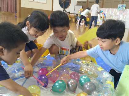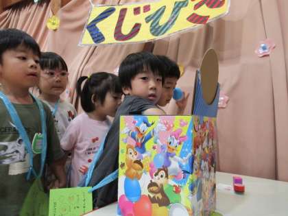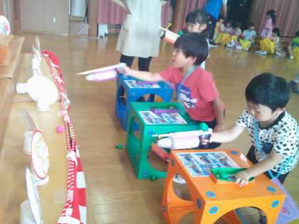 夏祭りごっこ 公開日 2023/07/18 更新日 2023/07/18 1日の生活 夏祭りごっこをしました。 ボーリングや射的、ヨーヨー釣りにくじ引き、写真屋さんで記念撮影!友達と一緒に各コーナーを回って楽しみました。