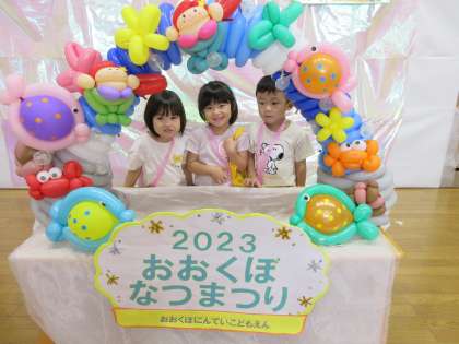 今年は、アリエルのバルーンアートの前で記念写真を撮りました。お土産をたくさんもらえて嬉しそうな子どもたちでした。