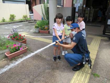 年長児は、実際のホースを持ち、放水体験をしました。力強く持っていないと体が動いてしまいます。消防士さんのすごさも感じることができました。
