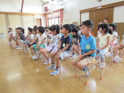今日は大沢野消防所から消防士の方々が来てくださり、火の危険な点や、約束を紙芝居や〇×ゲームを通して分かりやすく教えていただきました。