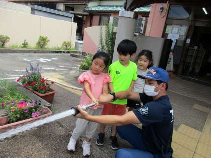年長児は、実際のホースを持ち、放水体験をしました。力強く持っていないと体が動いてしまいます。消防士さんのすごさも感じることができました。