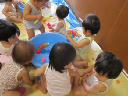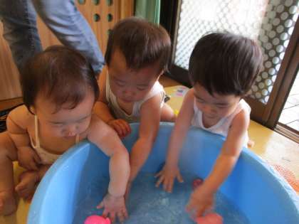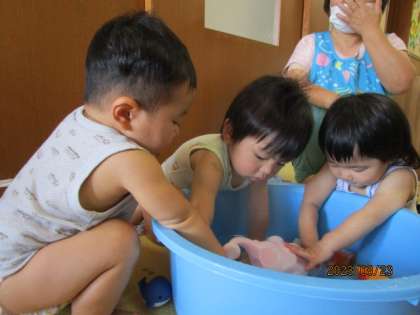 水遊びをしました。(ひよこ組) 公開日 2023/08/25 更新日 2023/08/25 1日の生活 ひよこ組の子どもたちは、毎日暑くても元気いっぱい! 少しでも涼しく感じられるように、お部屋の中でたらいの水を触って遊びました。 手でバシャバシャしたり、浮いているおもちゃをすくったりして楽しんでいました。