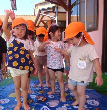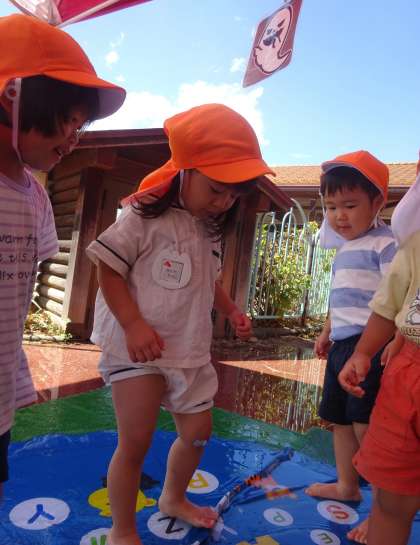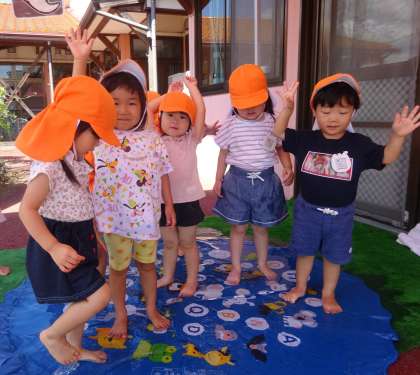 水遊びをしました(あひる組) 公開日 2023/08/25 更新日 2023/08/25 1日の生活 暑くても元気いっぱいの子ども達。今週は足だけ水に入って楽しみました。「足だけちゃぷちゃぷする!」とズボンを上までめくりあげて、やる気まんまん!「つめたーい!」とにこにこの笑顔がたくさん見られました。 水遊びの準備等、ありがとうございました。