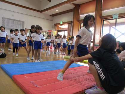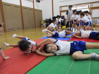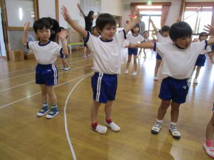 体操教室(こあら・ぱんだ組) 公開日 2023/10/05 更新日 2023/10/05 1日の生活 10月4日(水) 今日は体操教室がありました。今日は、おしり探偵の音楽で体操をノリノリでした後に、マットで前転や開脚前転などを練習しましたよ‼開脚前転の後はしっかりと決めポーズをして楽しそうに参加していました‼