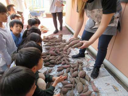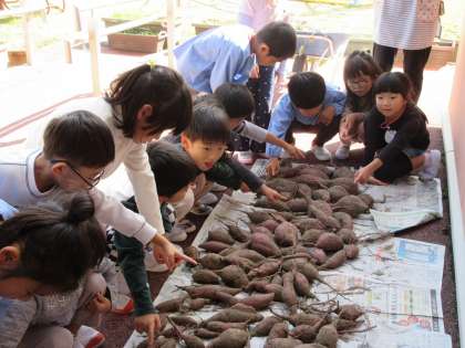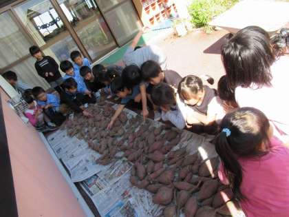 今日は畑のサツマイモを収穫しました。熊の出没が相次いでいるため、芋掘りは職員で行いました。採れたサツマイモを順番に見ながら「これ大きいね」「たくさんあるね」ととっても嬉しそうな子供たちでした。明日はみんなで重さや長さを測ってみよう!と、重たそうなサツマイモや、一番長いサツマイモを選びました。その後、1人1本、自分で好きなものを選んで袋に入れて持ち帰りました。みんなで育てたサツマイモ、お家でも味わってみてくださいね。