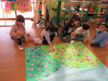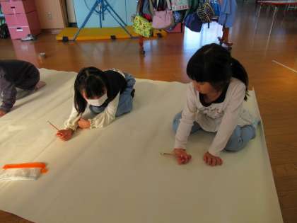 劇の大道具づくりの様子(きりん組、らいおん組) 公開日 2023/11/08 更新日 2023/11/08 1日の生活 11月1日(水) 劇に使う大道具づくりの様子です。絵を描いたり、折り紙を折って貼ったりとみんなで協力してつくっています。