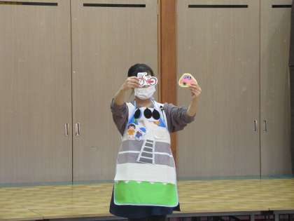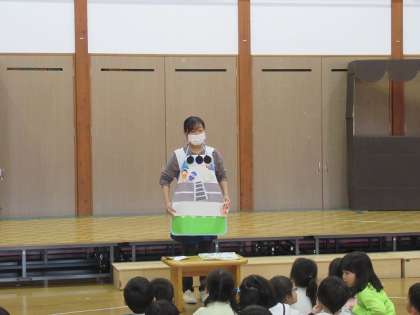 交通安全指導がありました。エプロンシアターを見て、道路の危険性や、横断歩道の安全な待ち方、渡り方を学びました。また、車の前後からの飛び出しの危険性、自動車はすぐに止まれないことも学びました。