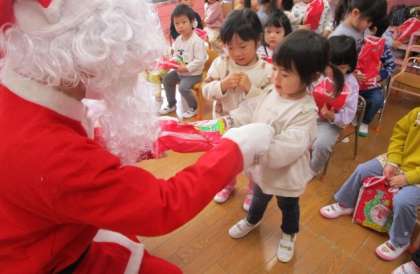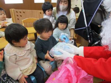 サンタさんがやってきました!(ひよこ・ぺんぎん・あひる組) 公開日 2023/12/21 更新日 2023/12/21 年間行事 小さい組さんのお部屋にもサンタさんがやってきました!サンタさんの登場に最初はびっくりしている子もいましたが、プレゼントをもらうとにっこり笑顔に。最後には「ばいばーい!またね〜」とサンタさんが見えなくなるまで手を振っていた子ども達でした。