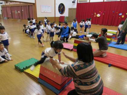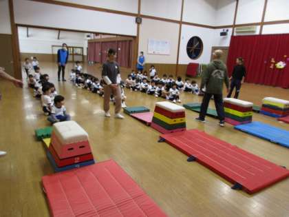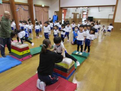 体操教室がありました。(ぱんだ、こあら組) 公開日 2023/12/21 更新日 2023/12/21 1日の生活 12月20日(水) 今日は体操教室で跳び箱をしました。体操教室の先生の話を聞いて、いざ挑戦‼ 開脚跳びでは、上手に跳べる子、おしりをついてしまう子と様々でした。中には、開脚することができずに跳び越えてしまう子もいましたが、「脚、パーにして!」と声をかけ続けることで、開脚をして跳べるようになりましたよ‼