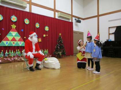 今日はクリスマス会がありました。みんなで『あわてんぼうのサンタクロース』を歌い終わると、ベルの音が聞こえてきました。サンタさんが登場すると、「やった〜!」と大喜び。年長の代表の子が「サンタさんはどうして空を飛べるの?」「どうやっておもちゃを作っているの?」等の質問をすると、ユーモアを交えて楽しく答えてくださいました。プレゼントをもらい、笑顔いっぱいの子ども達でした。お礼にみんなで『ジングルベルロック』を踊り、「また来年も来てね」とお別れしました。