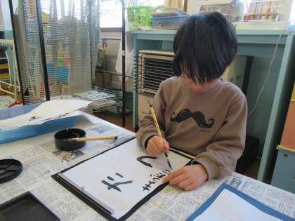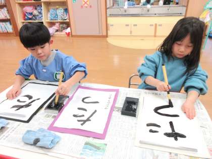 新しい年を迎え、みんなで順番に書初めに挑戦しました。今年の干支の「たつ」という文字を筆を使って丁寧に書きました。名前を小さく書くのが少し難しそうでしたが、真剣な表情で書いていた子供たちです。3学期は就学に向けて、文字の書き順も知らせていきたいと思います。