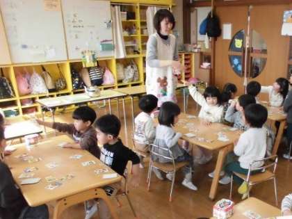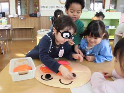 福笑いでは、目隠しをつけて顔のパーツを友達からもらうと、「これは目かな」「ここに置いてみよう」と探りながら次々パーツを置いています。目隠しを取ってできた物を見て、笑いが起きたり「上手〜」と歓声が起きたりして盛り上がっています。かるた取りは、友達よりも早く取ろうと真剣そのものです。取った枚数を数えるのも上手になってきました。