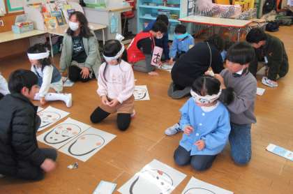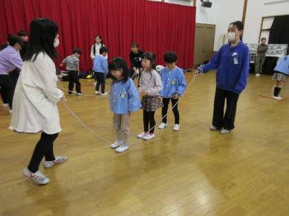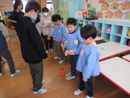 大久保小学校5年生との2回目の交流会がありました。今回はプレイルームや各クラスに、縄跳び・大縄跳び、福笑い、けん玉の3つの遊びを設定し、コーナーを周って正月あそびや伝承遊びを楽しみました。2回目ということで5年生さんともすぐに打ち解け、「一緒にしよう!」「どうやってするの?教えて」と会話をしながら楽しんでいました。
