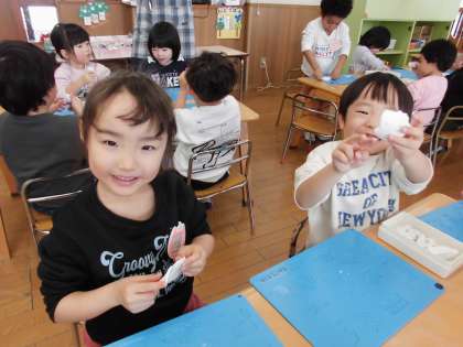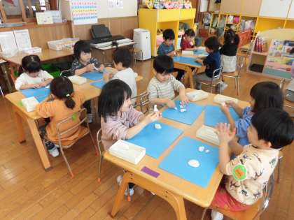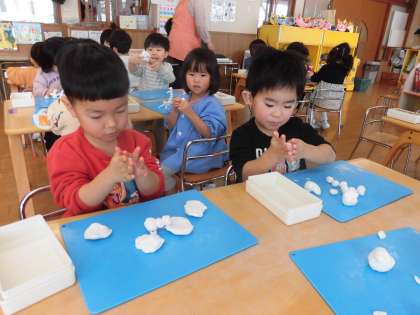 先日から心待ちにしていた粘土遊びをしました。保育教諭から使い方や約束を聞いてから始めました。粘土を手でこねて丸めて『だんご』や『ゆきだるま』を作ったり、細長くのばして『へび』を作ったり、思い思いに遊んでいました。「楽しかった〜!またやりたい!」と笑顔いっぱいの子ども達でした。お家でお話を聞いてみてくださいね。