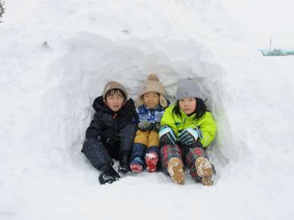 大きなかまくらが出来て、大喜びの子供たち。友達と一緒に記念写真を撮りました。