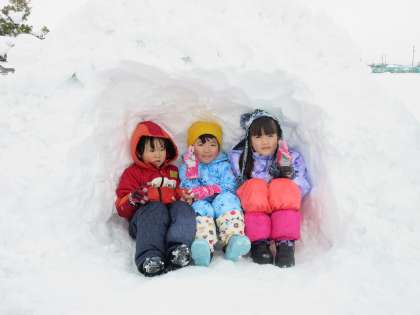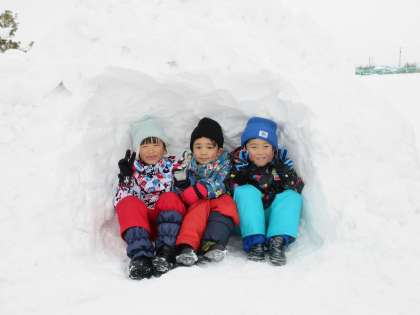 今日もみんなで雪遊びを楽しみました。かまくら作りや雪だるま作り、雪合戦、そり滑りとたっぷり楽しんだ子供たちです。