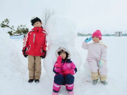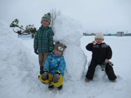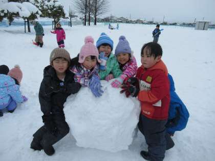 雪遊びの様子 その2(きりん、らいおん組) 公開日 2024/01/26 更新日 2024/01/26 1日の生活 大きな雪だるまを作ろうと、大きくて重たくなった雪玉を一生懸命転がす子供たち。 またまた友達と一緒に写真を撮って嬉しそうです。