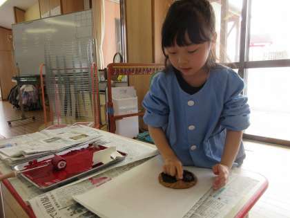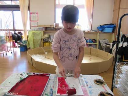 今日はスチレン板に掘った自分の顔の版画を刷りました。インクの色を自分で選び、丁寧にローラーで転がして色をつけました。版画が出来上がるととっても嬉しそうな子供たちでした。