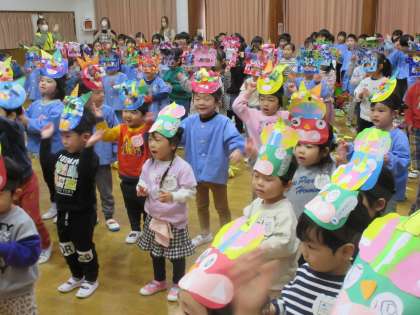 集会では、鬼のお面や追い出したい鬼の紹介をしました。子供たちの鬼のお面は、紙皿やティッシュ箱、紙袋に毛糸や画用紙、花紙等、様々な素材を工夫して使い「毛糸を貼るのを頑張りました」「ハサミで目や鼻を切ることを頑張りました」と思いがいっぱい詰まっていました。