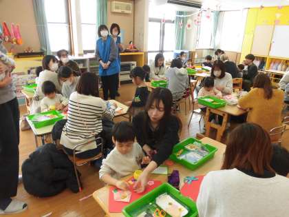 お忙しい中、保育参観に来てくださりありがとうございました。今回は、朝の会や製作活動で、子供たちが先生を見て話を聞こうとする姿やハサミ・のりの使い方を守りながら取り組む姿を見ていただきました。保護者の皆様も子供たちが大きく成長してきたことを感じられたと思います。短い時間の活動でしたが、ぜひご家庭でも親子で一緒に作ったり、遊んだりすることを楽しんでほしいと思います。本日はありがとうございました。