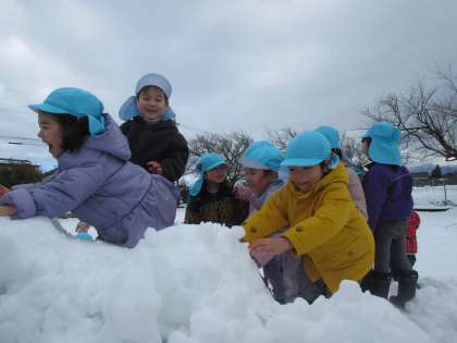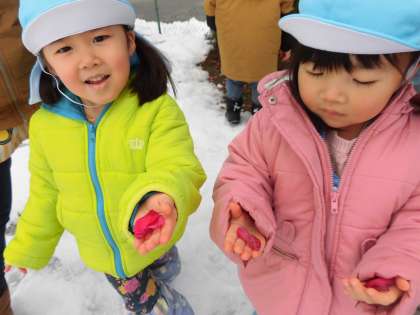 時折吹く冷たい風に「手が冷たい」と話していた子ども達ですが、歩いているうちにポカポカ暖まり、だんだんと出てきた太陽に「おひさまおはよ〜!」と挨拶しているかわいい姿がありました。公園では落ちていた椿の花びらをみつけ「ハートみたい」と集めたり、大きな氷をみつけ触ってみると「かたいね」「ざらざらする」といろいろな発見をしながら楽しんできました。