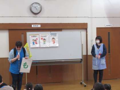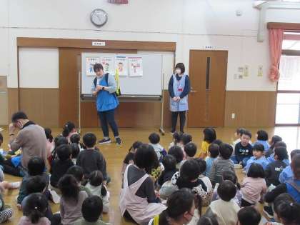 今月の災害時対応訓練では、近隣の民家が火事になったときの避難やこれまでの災害時対応訓練の振り返りを行いました。園では、避難するときのお約束として「おはしも」を子供たちに教えています。振り返りの場面では、子供たちは「友達をおさない」「走ると転んでしまう」「先生や放送を静かに聞く」「戻ったら危ない」とお約束を守ることの大切さに気付き、意識して取り組む姿が見られました。