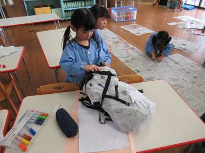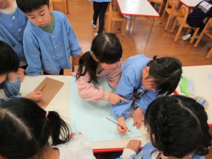 先週はお化け迷路の中の貞子を作ったり、屋根を作ったりした子供たち。昨日でポケモンびっくりお化け迷路と温泉とサウナがほとんど完成したので、今日はみんなで遊ぶ時の約束を決めました。どんな約束があったら良いかをみんなで話し合い、他のクラスにも分かるように看板をつくって貼ることにしました。友達と思いを出し合ったり協力したりしてとても楽しそうな子供たちです。
