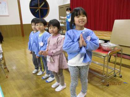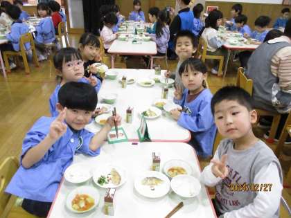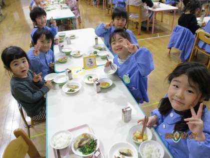お別れ週間2日目 お別れ会食(2)【年長・年中】 公開日 2024/03/04 更新日 2024/03/04 1日の生活 みんなで食べるとおいしいね。 年中はテーブルの準備や、「いただきます」「ごちそうさま」の挨拶の係もがんばりました。