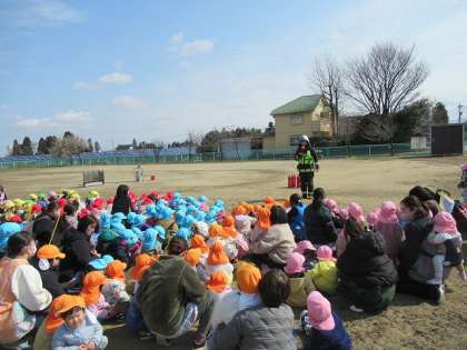 今月はなんと!大沢野消防署の消防隊員さんの訓練を見せてもらいました。消防車からホースが伸び、こども園の屋根に向かって放水されると、子供たちから「すごい!!」と歓声が上がりました。