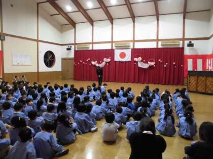 3学期の終業式がありました。4月から新3歳児になる、あひる組の友達も一緒に終業式に参加しました。終業式では、副園長先生の話を姿勢を正して、真剣に聞いている姿が見られ、成長を感じました。