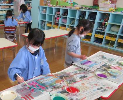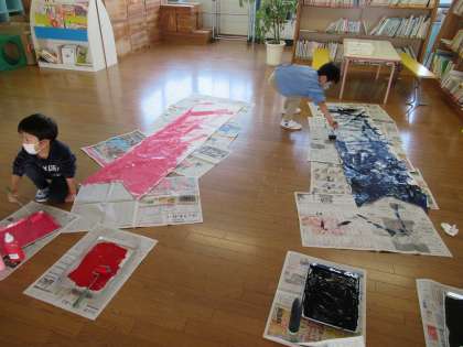 玄関の壁面製作が完成しました!(つばめ組) 公開日 2020/04/11 更新日 2020/04/11 1日の生活 4月10日(金) 新学期が始まってから少しずつ製作に取り組んでいた玄関の壁面が完成しました。大きなこいのぼりにローラーで色をつけたり、水彩のにじみ絵でうろこをつくったりしました。大きなこいのぼりには、子供たちが楽しそうに乗っていますよ。自分の顔を画用紙でつくったり、折り紙で兜をつくったりしました。