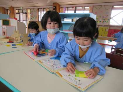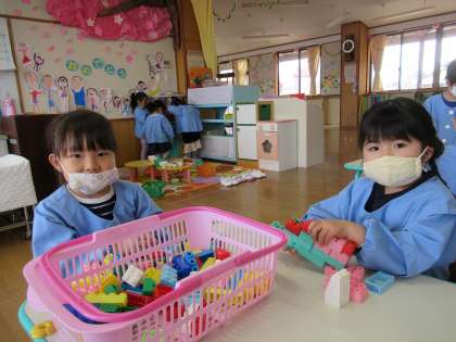 進級し、新しいバッチが嬉しくて仕方ない様子のたんぽぽ組さん。友達と一緒にままごとやぬりえ、レゴブロックなどをしたり、ウレタン積木を組み立ててお家をつくったりして遊んでいます。「今日は何して遊ぼうかな」「○○ちゃん、あっちで一緒にままごとしよう」と声を掛け合いながら、友達と遊ぶことを楽しんでいます。晴れた日には、なかよし広場で砂遊びや鉄棒、滑り台やブランコなど、自分のしたい遊びを見付けて遊んでいます。