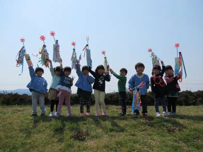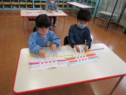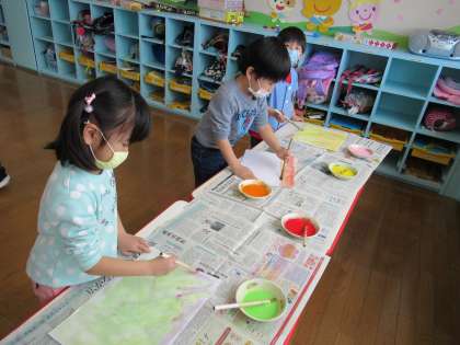 大きなこいのぼり製作の次は、自分だけのこいのぼりづくりに取り組みました。絵具で色を塗ったり、編み込みや蛇腹折りをしたりしてつくりました。編み込みは少し難しかった様子でしたが、慣れてくると「きれいだね」「炭治郎みたいだね」と嬉しそうにつくっていましたよ。今日は出来上がったこいのぼりを持って、ピーターパン広場で走ってきました。風車が回るのを見て喜んで走っていた子供たちです。