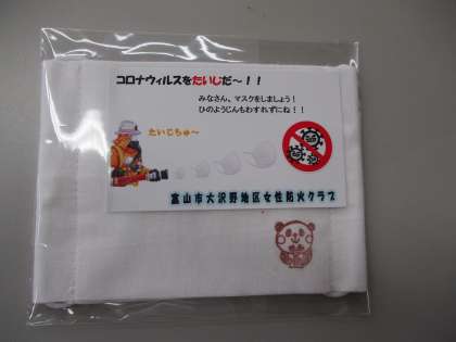 富山市大沢野地区女性防火クラブの皆さんから、子供用の手作りマスクをいただきました。女性防火クラブの32名で、450枚以上も作られ、今日は大久保幼稚園と大久保保育所に持ってきてくださいました。さらしを利用して縫い合わせ、消毒してアイロンがけもしてあります。かわいいパンダのスタンプのデザインもされたそうです。幼稚園が始まったら、子供たちに配布するので、楽しみに待っていてくださいね。