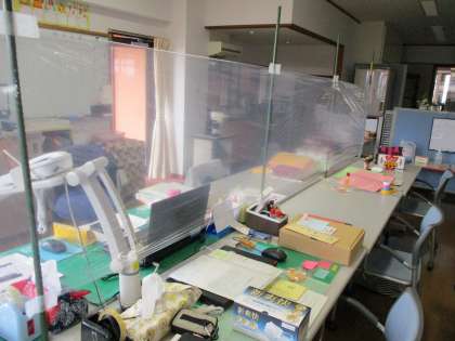 職員室には、飛沫飛散防止のため、ビニールシートを張りました。
