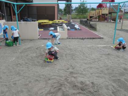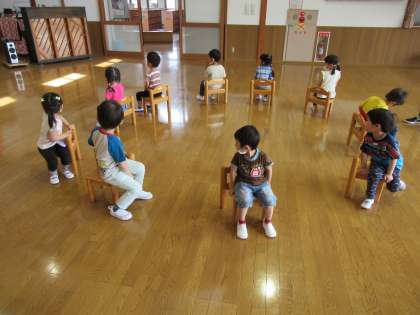 今日は分散登園2日目でした。幼稚園の生活を少しづつ思い出してきた様子の子供たち。プレイルームでは椅子取りゲームをして遊びました。繰り返して遊ぶうちに、「音楽をよーく聴いて、音が止まったら座る」を上手にできていましたね!楽しかった様子でゲームの名前もばっちり覚えていましたよ。外でも砂遊びや遊具で元気いっぱいに遊ぶことができました。