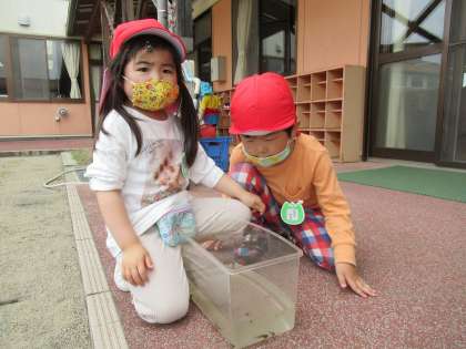 まずは、お休みの間にどれだけ大きくなったか、発育測定をしました。「重たくなったかな」「ちょっぴり大きくなったよ」と話し、順番に測定しました。着ていた服をたたんでかごに入れることも忘れずにしていましたよ。その後は、ピーターパン広場へ行きました。広い場所で山から駆け下りたり、花を摘んだり・・・好きな遊びを見付けて楽しみました。広場の隣の田んぼにオタマジャクシを見付けて大騒ぎ。先生が網でオタマジャクシを捕まえ、バケツに入れると、食い入るように見ていました。今日は、仲良し広場でも遊び、たくさん体を動かしました。一緒に遊んでいて、写真を撮り忘れてしまいました。ごめんなさい。