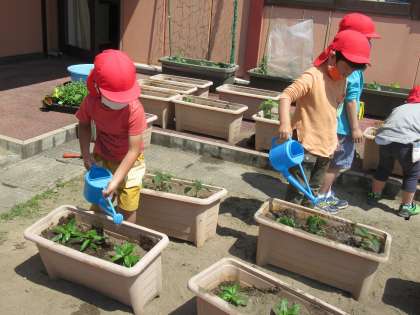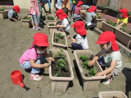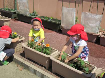 小さなスコップで穴を掘り、穴の中に水を少し入れてから苗を植えました。最初は手が汚れるのを気にしていた子も、友達の様子を見たり先生と一緒にしたりして植えていました。最後にたっぷり水をかけ、きれいに咲いてくれることを祈っていました。