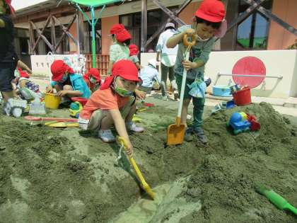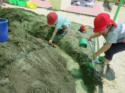 昨日の続きの砂遊び。今日も水を流し、川をつなぎ、スコップで掘り進めていました。友達とのごちそうづくりも楽しみました。
