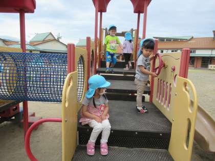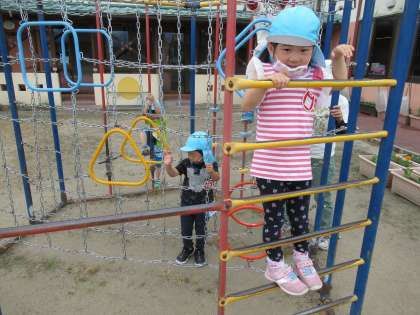 今日は外で体を沢山動かして遊びました!バスごっこをして遊んだ子は「お客様、お座りくださーい!」「もうすぐバスが出発します!」と、友達と楽しそうに会話を交わしながら遊んでいました。六角ジムに挑戦した子は、たんぽぽ組のお姉さんお兄さんが高い所まで登るのを見て圧倒されながら、「自分も!」と果敢に挑戦していましたよ。