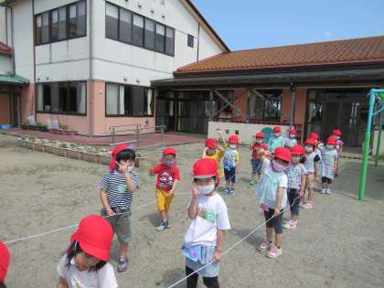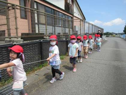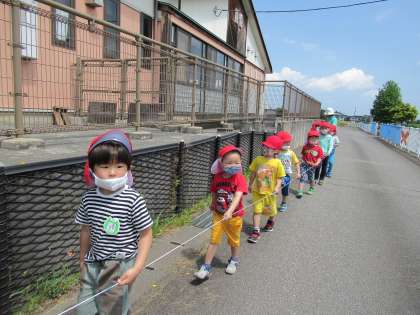 幼稚園の周りを歩きました(たんぽぽ組) 公開日 2020/06/02 更新日 2020/06/02 1日の生活 6月2日(火) 久しぶりに散歩に出かけました。一列で間隔をあけて歩けるように、誘導ロープを使って歩きました。昨日、園舎内でも少し歩いていたので、間隔を意識しながら歩いていました。花や鳥の声、ヘリコプターの音などを感じ、楽しんでいました。