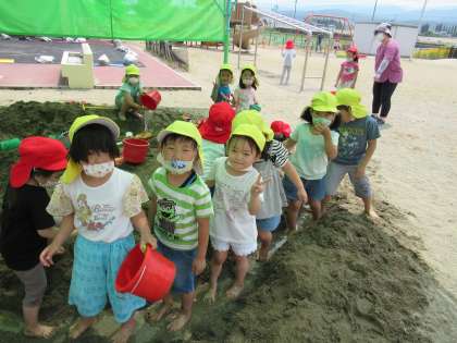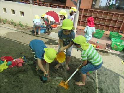 今日はピーターパン広場でかけっこをした後、裸足になって園庭の砂場で遊びました。たんぽぽ組さんがつくっていた川を一緒に掘って繋げたり、新しい川をつくったりして、水をたくさん流して遊びました。出来上がった川をみんなで歩き「冷たくて気持ちいいね」「川の迷路みたいだね」「僕はこっちの川に行くよ」と喜んでいた子供たちです。