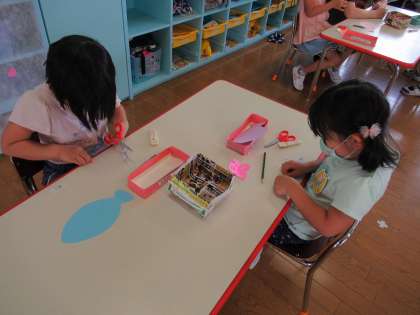 たっぷり遊んだ後は、壁面製作をしました。切り紙を小さな紙でつくるのは難しそうでしたが、様々な形になるのが面白く、広げて見る度に「見て見て。こんな形になったよ」と嬉しそうに見せてくれました。先日からつくっている作品も次々と仕上がってきましたよ。